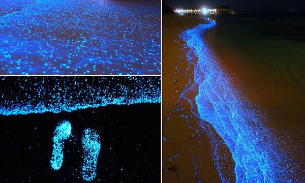 A legszebb és legkülönlegesebb tengerparttal véleményünk szerint a Maldív-szigetek rendelkezik, ezért ezt hagytuk a listánk végére. A fehér homokos tengerpart már önmagában is a luxusra vágyók millióit vonzzák évente az aprócska szigetcsoportok egyikére, de a legérdekesebb látványban azoknak lehet része, akik egyik este összetalálkoznak a partra sodródó fitoplanktonokkal. Ezekben a planktonokban a partra érve egy kémiai reakció megy végbe, melynek során fényt bocsátanak ki magukból és ennek köszönhetően a szerencsések azt láthatják, hogy a tengerpart kéken világít. Ezt a ritka jelenséget biolumineszcenciának hívják.