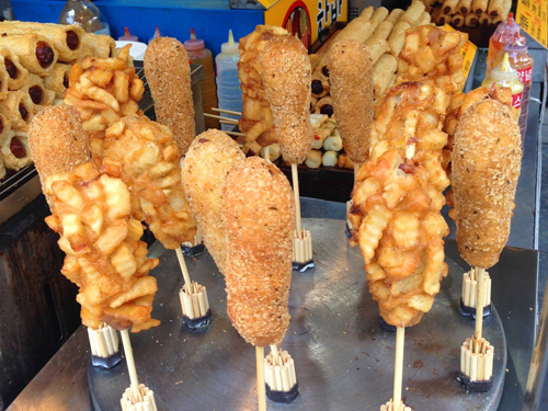 Korea nyüzsgő utcáin járva számtalan étel furcsasággal találkozhatunk, így talán nem is meglepő a koreai hotdog egyedi megjelenése sem. A virslit egy fa pálcára húzzák fel, majd egy kukoricalisztes palacsintatészta szerű masszába forgatják bele, míg végül kockára vágott krumplival vonják be az egészet. Az így forró olajban kisütött pálcikás kutya egy igazi kuriózumnak számít.