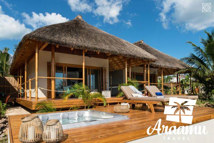 Válasszon a 46 privát bungalóból, 6 lakosztályból vagy 3 trópusi kertben elhelyezett villából, ami lenyűgöző kilátást nyújt az óceánra. Minden szobatípus modern és afrikai művészettel is díszített. Felszereltség: kültéri és beltéri zuhanyzóval ellátott fürdőszoba, hajszárító, fürdőköpeny, szúnyogháló, műholdas TV, DVD-lejátszó, WLAN (ingyenes), széf, légkondicionáló, minibár (felár ellenében), valamint tea- és kávéfőző.